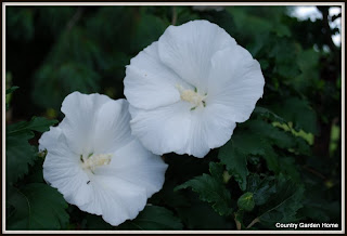 Blooming in my garden today is a white Rose of Sharon (Hibiscus syriacusa) that came as a pass along plant from my mother in law many years ago. There are others in the group that she gave me but this solid white has always been my favorite.