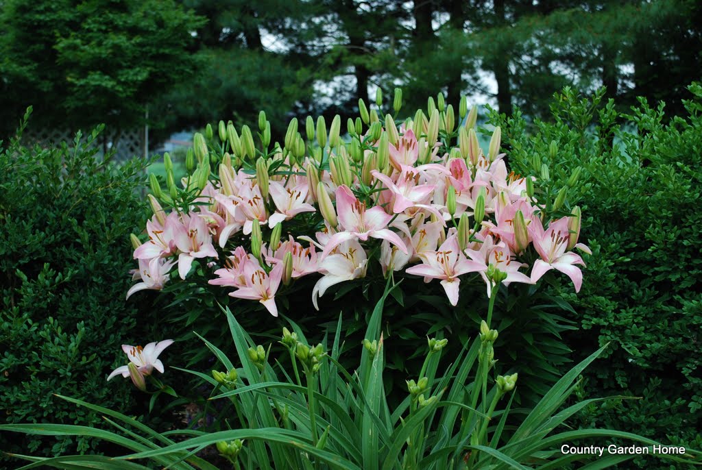 The Asiatic lilies have started to bloom. This is one of the very first that I bought just to try to see if they would grow in my garden so I don't have it's name. It is always one of the first to bloom. Below those blooms are the buds of one of the many daylilies that grow in my garden.